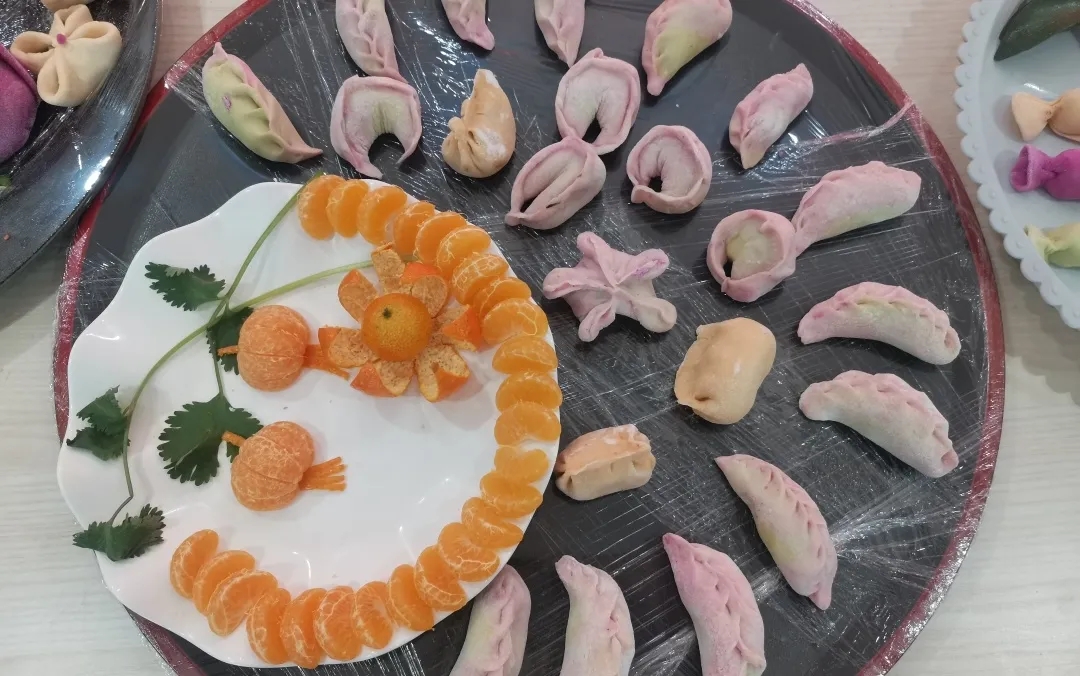和面、搟皮、包餃子,大家很快進(jìn)入各自的角色,井然有序地忙活起來。只見他們把餃子皮攤在手心,用筷子夾餡料放在皮中間,開始合攏捏花紋,不一會一個個成型的餃子立馬誕生,各種花式餃子悉數(shù)亮相,大家時而探討心得,時而過招切磋,一派其樂融融的景象。