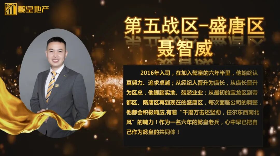 2016年入司,在加入懿皇的六年半里,他始終認(rèn)真努力、追求卓越;從經(jīng)紀(jì)人晉升為店長,從店長晉升為區(qū)總,他腳踏實地、兢兢業(yè)業(yè);從最初的寶龍區(qū)到帝都區(qū)、隋唐區(qū)再到現(xiàn)在的盛唐區(qū),每次面臨公司的調(diào)整,他都會積極響應(yīng),有著“千磨萬擊還堅勁,任爾東西南北風(fēng)”的魄力!作為一名六年的懿皇老兵,心中早已把自己作為懿皇的共同體!